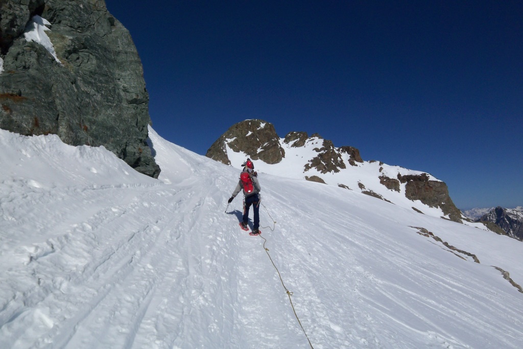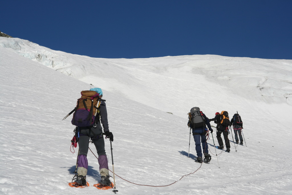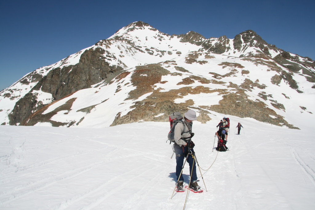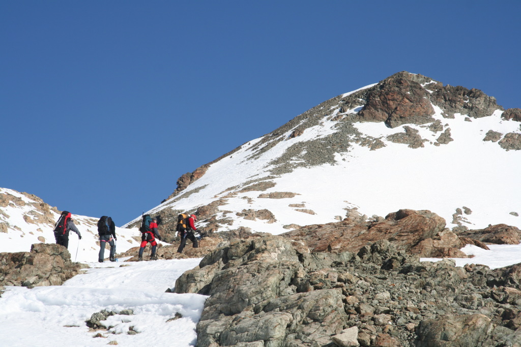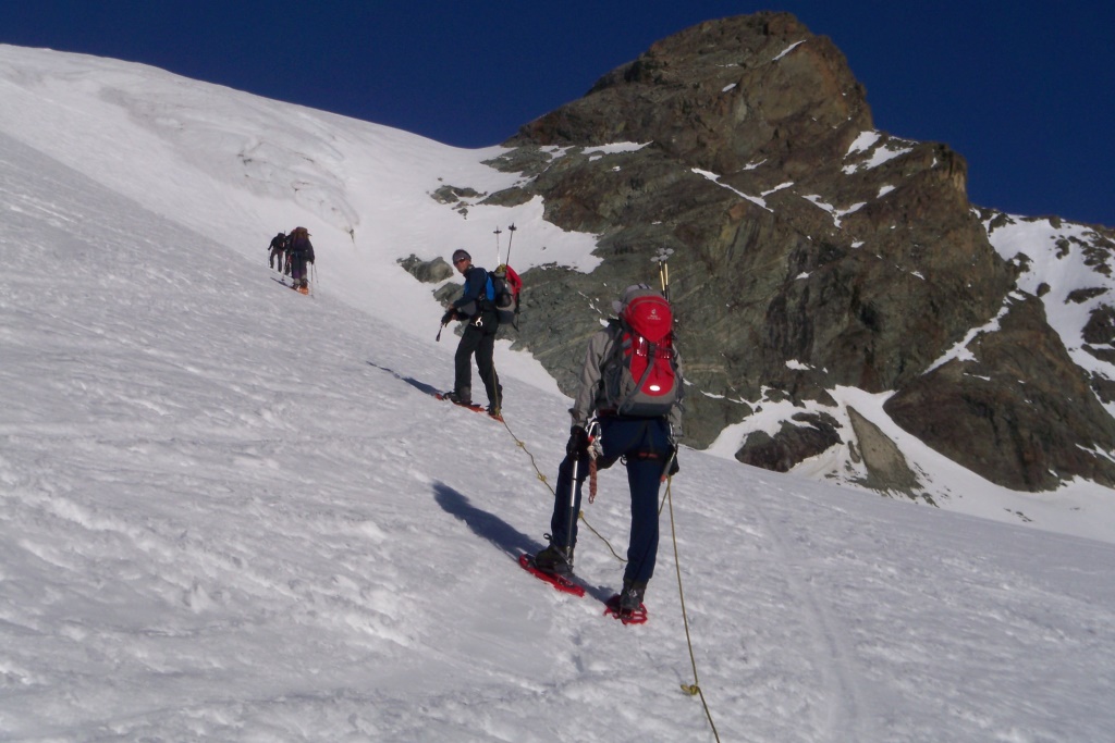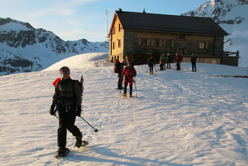 Sommerhochtouren gehören zum Standardprogramm des engagierten Bergsteigers. Skihochtouren im Winter sind eine Lieblingsbeschäftigung derjenigen Bergsteiger, die auch auf zwei Brettern gut unterwegs sind. Was machen aber diejenigen im Winter, die zwar sommers viele Gletschertouren unternehmen, für die aber das Skifahren ein Buch mit sieben Siegeln ist? Sie versuchen es einfach mal mit Schneeschuhen. Was im Allgäu oder Lechtal prima klappt sollte auch auf Gletschern kein Problem sein dachte sich eine zwölfköpfige Gruppe unter Leitung von Kai Schroeder (Bezirksgruppe Remstal) und Jochen Furch (Alpine Tourengruppe) und bezog von 13. bis 16. April 2007 Quartier in der Jenatschhütte (2652 m) in den Albula Alpen.