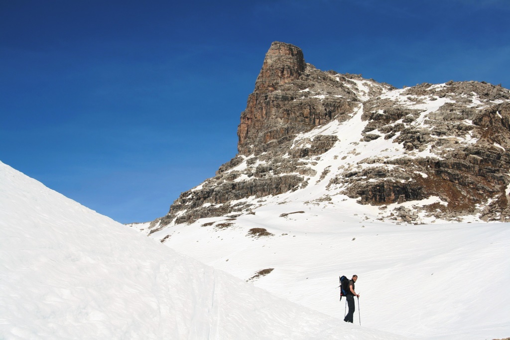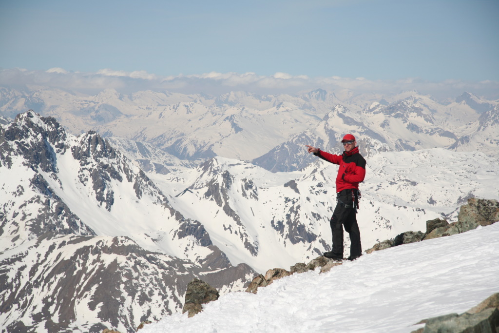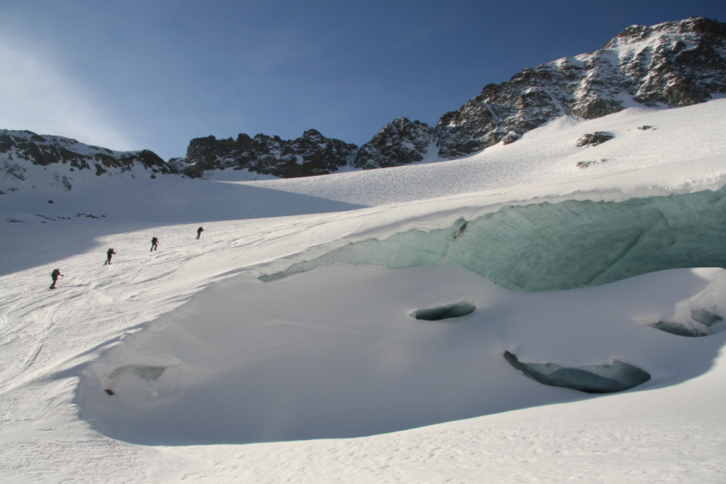 Dass der Sommer 2007 schon im April begann, machte schon der Start am Julierpass deutlich: gut 13 Grad Mittagstemperatur und extrem weicher, sulziger Schnee gestalteten den Aufstieg zur Fuorcla d'Agnel (2987 m) ausgesprochen mühsam. Die nicht eben leichte Ausrüstung (komplette Hochtouren- und Lawinenausrüstung) drückte uns heftig in den schweren, weichen Schnee hinein. Ohne Schneeschuhe wäre überhaupt kein vorankommen möglich gewesen und selbst mit Schneeschuhen standen wir häufig bis zu den Oberschenkeln im sulzigen Weiß. Von der Fuorcla d'Agnel aus sieht man die Hütte schon zum Greifen nah und ahnt, dass der Hüttenwirt, Röbi Hofer uns auch schon mit seinem Fernglas erspäht hat. Wir waren sehr froh, dass der letzte steile Osthang, direkt vor der Hütte, problemlos (mit Sicherheits-abständen) gequert werden konnte. Bei heikler Lawinelage hätte sonst ein knapp 200 Hm Abstieg mit anschließendem Wiederaufstieg gedroht! Mehr oder weniger erschöpft erreichten wir nach gut 5 Stunden die Hütte und wurden mit Tee und freundlichen Worten empfangen. Eine Geste die leider sehr selten geworden ist, aber in der Jenatschhütte noch Tradition hat. Die Tourenplanung der kommenden Tage wurde durch das anhaltend warm vorhergesagt Wetter und den Lawinenlagebericht bestimmt. Letzterer war täglich Stufe zwei für Schneebretter morgens, im Tagesverlauf dann Stufe auf drei steigend für Nassschnee-lawinen, an Südhängen bis über 3000 m Höhe. Somit war klar, sehr früh starten, Touren möglichst bis zum frühen Nachmittag beendet haben und Südhänge am Nachmittag meiden. Nach erholsamer Nacht und leckerem Frühstück mit hausgemachtem Müsli, selbstgebackenem Brot und bestem Bergkäse war dann auch gleich der höchste Gipfel im Umkreis der Hütte das Tagesziel, der Piz Calderas, immerhin 3397 m hoch. Nach dem üblichen morgendlichen LVS-Check und knapp einer Stunde gemütlichem Dahinwatscheln mit den Schneeschuhen auf noch recht festem Harschdeckel standen wir am Gletscher, seilten an und hatten endlich das ersehnte Eis unter den Schneeschuhen. Der Gletscher war sehr gut eingeschneit, wobei wir jedoch gleich am Anfang an einer imposanten Eisgrotte vorbei kamen, die deutlich zeigte, dass unter dem Schnee ein dicker Eispanzer liegt. Anseilen ist auf diesem Gletscher auch im Winter für Schneeschuhgeher Pflicht. Anders als bei den Skitourengehern ist es allerdings mit Schneeschuhen sowohl im Auf-, wie im Abstieg auch kaum störend. Der Calderasgletscher zieht über zwei gut 30 Grad steile Rampen hinauf auf ein Gletscherplateau auf gut 3100 m Höhe. Ab hier kann man dann zunächst abseilen und steigt über eine Firnflanke, zum Schluss über Geröll und Fels auf den Gipfel hinauf. Aufgrund des stabilen Hochdruckwetters war die Aussicht fast unglaublich. Der Piz d'Err, das Ziel des nächsten Tages, in Schneeballwurfweite. Weiter weg im Osten, aber bestens zu erkennen: Piz Roseg, Piz Bernina mit Biancograt, Piz Palü, Ortler, Zebru und Königspitze. Den Blick nach Süden dominiert der Piz Platta und die Berge um das Averser Hochtal, im Hintergrund das im Winter beliebte Cilchalphorn im Rheinwaldgebiet. Nach Westen zu trauen wir unseren Augen fast nicht, sehr klar und in ganzer Pracht zeigten sich die Monte Rosa. Wieder unten am Gletscherplateau erblickt man auf der gegenüberliegenden Seite die Tschima da Flix, mit 3301 m ein weiterer schöner Hochtourengipfel, der zudem einen Abstieg in die Fuorcla da Flix ermöglicht von der aus man ebenfalls wieder die Hütte gut erreichen kann. Es drängte sich förmlich auf diese Variante zu wählen. Wir seilten wieder an, stiegen über den Gletscher in einen Sattel kurz unterhalb des Gipfels. Die letzten Meter zum Gipfel der Tschima da Flix gingen dann über einem etwas schmalen Fels-/Firngrat, der jedoch mit Hilfe von Steigeisen und eines Fixseils sicher und schnell überwunden werden konnte. Über einen breiten Rücken ging es anschließend rasch hinab in die Fuorcla da Flix und schon im Abstieg erkannten einige den markanten Piz d'Agnel (3205 m), der sich mit einem steilen Grat von der Fuorcla empor zieht. Eigentlich nicht geplant, aber da wir sehr gut in der Zeit waren beschlossen einige auch diesen Gipfel noch zu besteigen. Drei 3000der auf einen Schlag sozusagen, ein Gletscher, 1200 Hm Auf- und Abstiege und 10 Stunden auf Tour war die befriedigende Bilanz für den ersten Tag. Zudem waren wir, wenn auch etwas später wie geplant, rechzeitig genug zurück um noch die wärmende Sonne vor der Hütte genießen zu können. Am dritten Tag stand dann der König des Gebiets, der Piz d'Err (3378 m), auf dem Programm. Weitere Gipfel lagen hier nicht am Weg, wobei der Piz d'Err als insgesamt schwieriger einzustufen ist, als die Gipfel des Vortags, es ist also kein Fehler hier entsprechende zeitliche Reserven zu haben. Zum d'Err Gletscher ist es gut eine halbe Stunde weiter, wobei der sich zudem auch deutlich imposanter zeigt. Ein Steilaufschwung von gut 35 Grad, rechts große Spalten, in der Mitte eingescheit, halblinks ein Eisbruch und ganz links ebenfalls gut eingeschneit und (noch) schattig. Die Skispur zieht mittig durch, wir entschieden uns für ganz links, da der Schatten uns länger harten Firn erhoffen lies. Die Hoffnung bestätigte sich, denn wir konnten problemlos, angeseilt den steilen Hang hinauf steigen. Auf 3200 m errichten wie ein größeres Gletscherplateau mit bizarren Felsen und Türmen in der Umrandung und nicht wenigen welligen Eindellungen im Firn, die deutlich zeigten, dass man im Sommer hier sicher einer ordentliche Spaltenkurverei hat. Im April war's kein Problem und so erreichten wir schnell über eine Schulter hinweg den eigentlichen und sehr imposanten Gipfelaufbau des Piz d'Err. Der weitere Weg war eindeutig, eine gut 100 m hohe und 40 Grad steile Firnflanke hinauf in eine Scharte kurz unter dem Gipfel. Mit Steigeisen und Pickel konnte die Flanke problemlos erstiegen werden, in der Scharte angekommen war es noch eine Seillänge über 