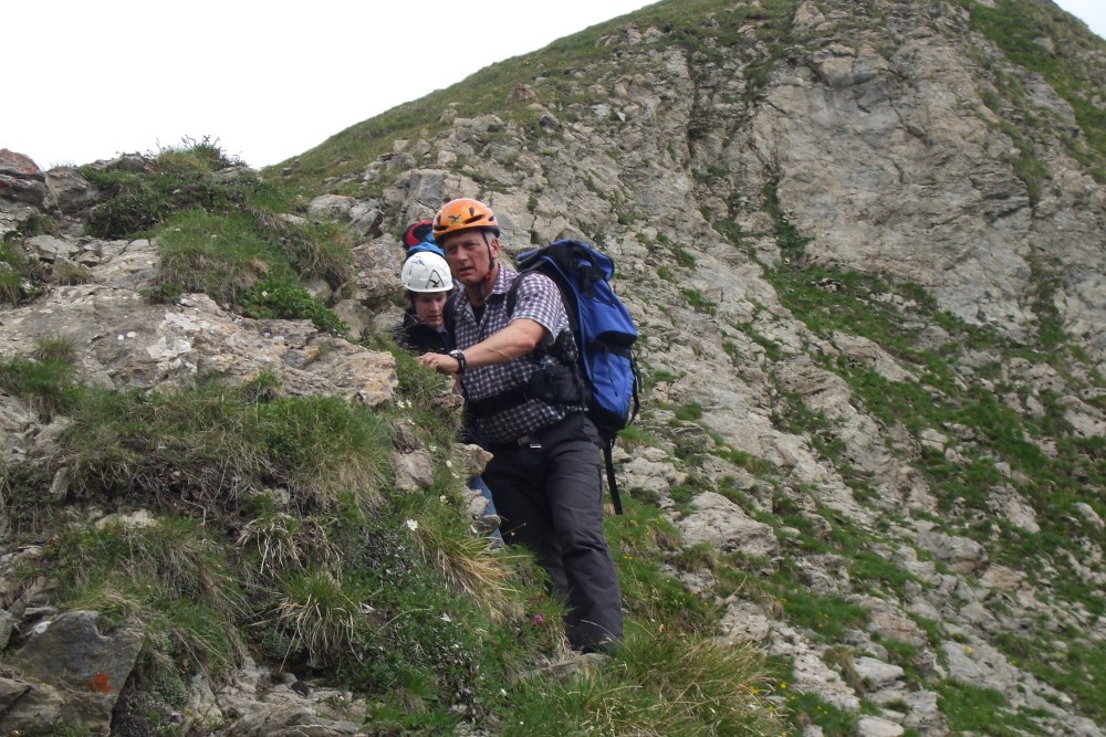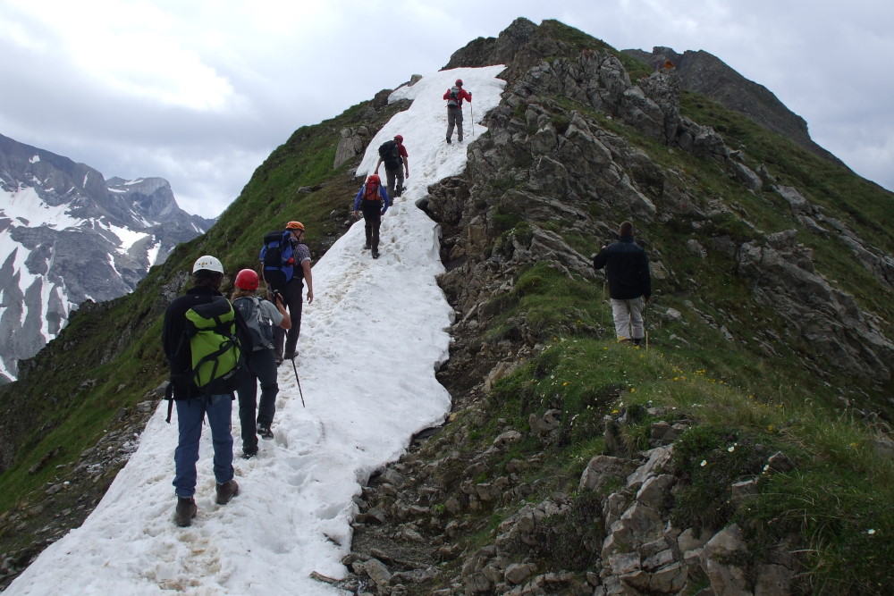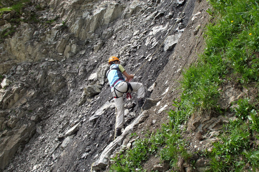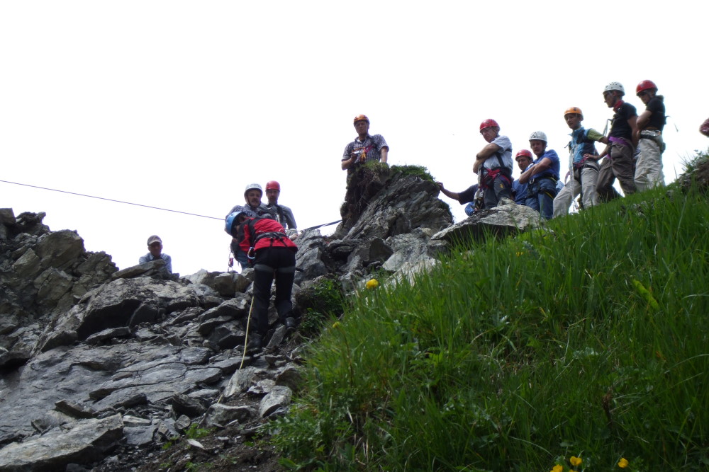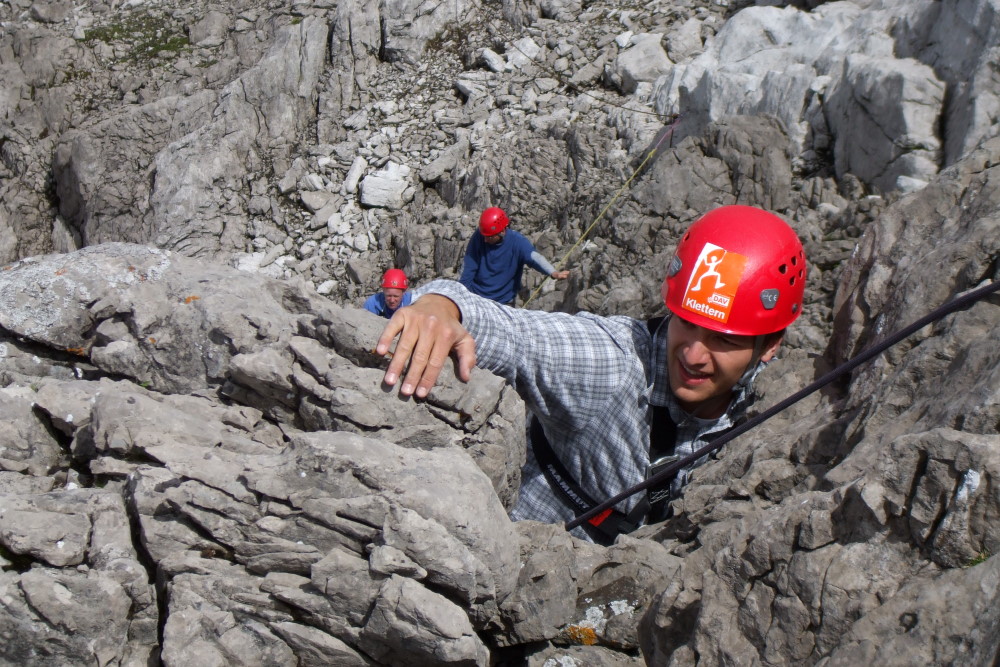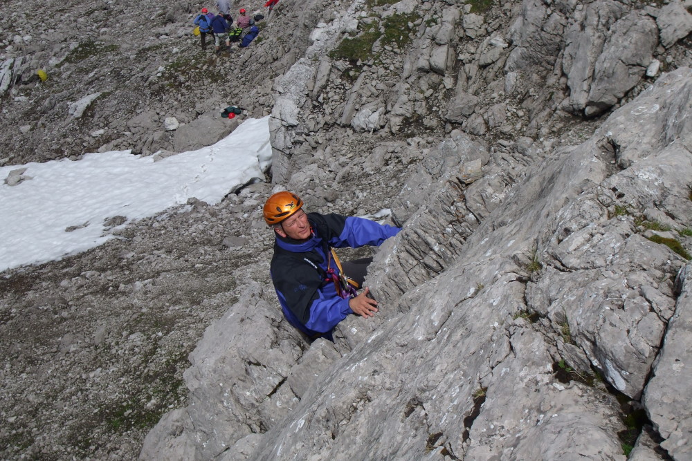 Topo des neuen Klettersteigs Die Leitung des Kurses hatten Helmut Reinhard und Kai Schroeder, tatkräftig unterstützt von der Leiterin der Klettergruppe Ira Knabbe und Jochen Ritter (Klettergruppe). Kursinhalte und -ablauf Donnertag 14.6. Anreise bis 19 Uhr, danach Theorie 'Tourenplanung'. Freitag 15.6. Gurte anlegen, Einbindeknoten, Einbinden, Hängeübungen, -demonstrationen. Tour zu Rotschrofenspitze (2588 m), eingelagert Übungen zur Orientierung, Gehen in Schrofen und Firn. Umfassende Übung 'Auf- und Absteigen am Fixseil', sehr authentisch am Falmedonjoch. Abends Theorie 'Knotenkunde' und 'alpine Gefahren'. Samstag 16.6. Morgens Theorie 'Wetterkunde'. Begehung des Übungsklettersteigs, der entlang der drei neuen Kletterrouten gelegt wurde. Er gliederte sich in drei Sektionen, die frei geklettert dem Schwierigkeitsgrad II, III und IV entsprechen. Durch kurze Sicherungsabstände bestens gesichert konnte hierbei jeder für sich sein 'Wohlfühlgelände' bzw. dessen Grenzen auf Klettersteigen erkunden. Abends Theorie 'Orientierung' Sonntag 17.6. Morgens Theorie 'Ausrüstung' und 'Behelfsmäßige Bergrettung, 1. Hilfe auf Tour' Wanderung zur Kaiser Alm mit ausführlichen Orientierungsübungen (Karte anwenden im Gelände, Zusammenspiel von Karte und Kompass, Einführung GPS). Abschlussbesprechung auf der Kaiser Alm, Heimfahrt. Fazit: Der Kursverlauf war erneut sehr erfolgreich, was sowohl die große Nachfrage nach dem Kurs selbst, als auch die Rückmeldung der Teilnehmer/-innen bestätigte. Durch die neuen Kletterrouten und den Übungsklettersteig konnte der Kurs deutlich aufgewertet werden. Bericht und Bilder: Kai Schröder Und hier noch zum Schluß: Kai's Bergtourengrundkurs-Präsentation |