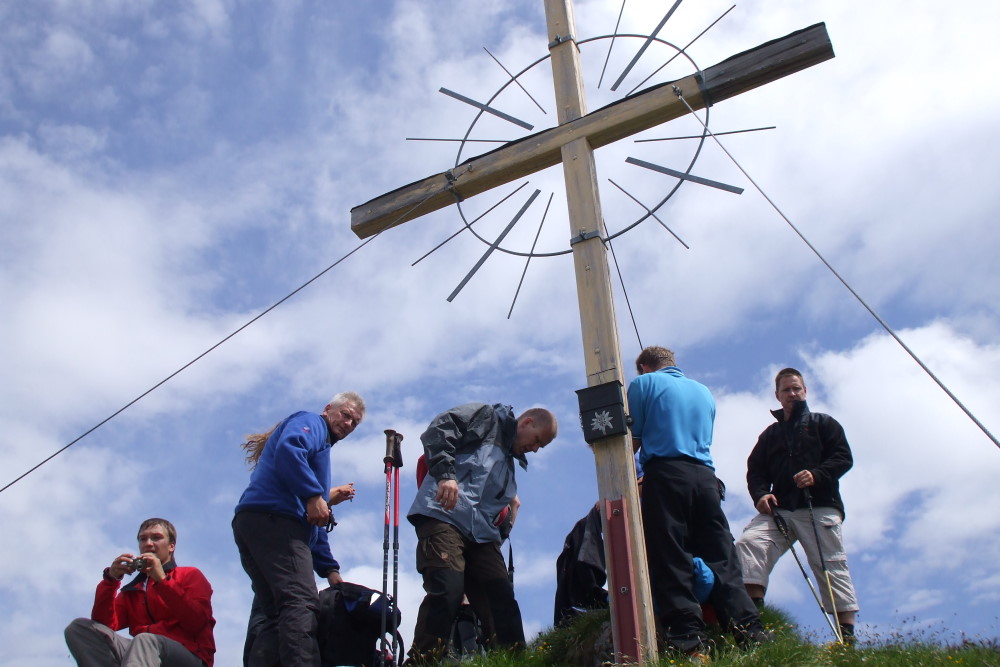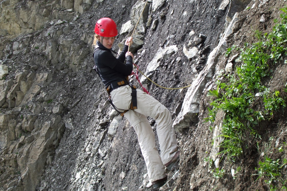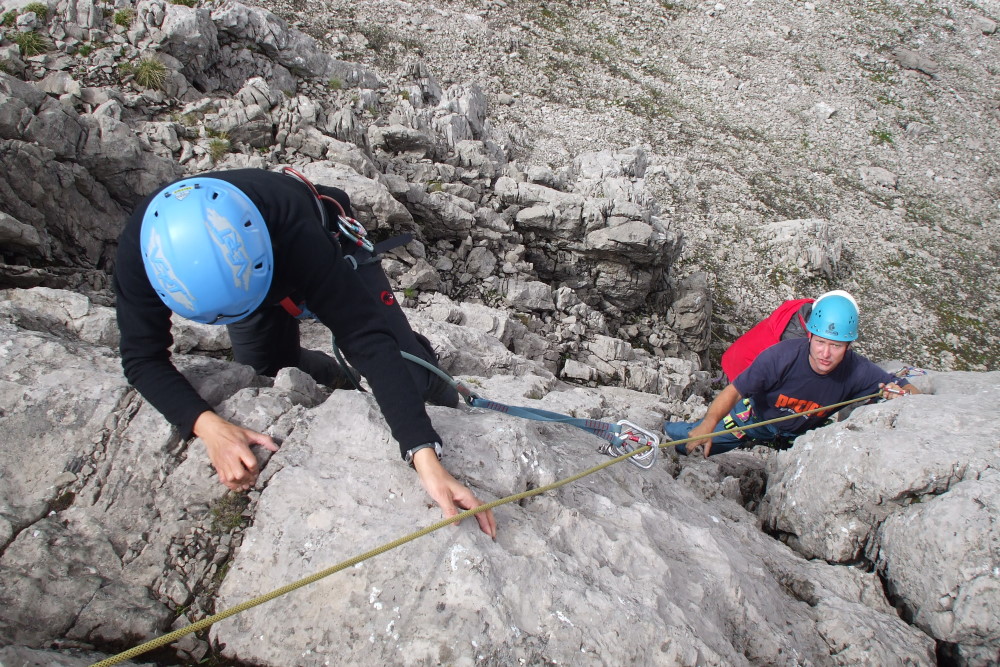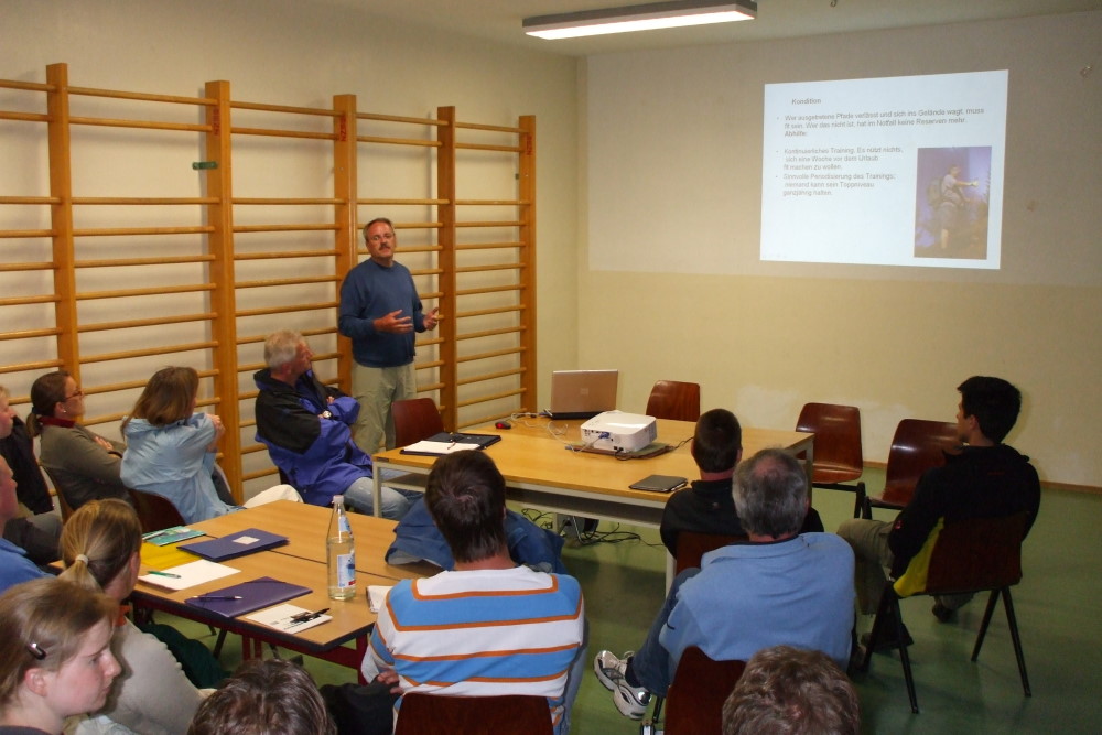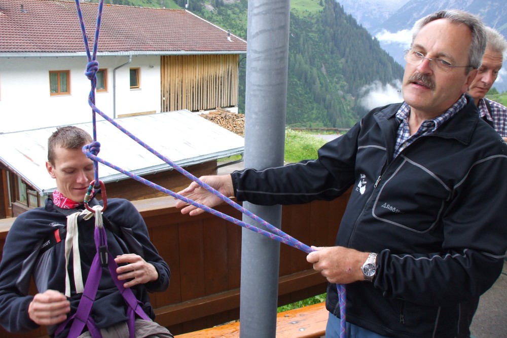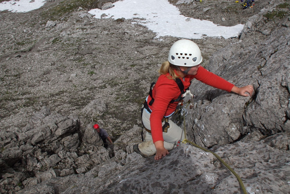 Topo des neuen Klettersteigs Die Leitung des Kurses hatten Helmut Reinhard und Kai Schroeder, tatkräftig unterstützt von der Leiterin der Klettergruppe Ira Knabbe und Jochen Ritter (Klettergruppe). Kursinhalte und -ablauf Donnertag 14.6. Anreise bis 19 Uhr, danach Theorie 'Tourenplanung'. Freitag 15.6. Gurte anlegen, Einbindeknoten, Einbinden, Hängeübungen, -demonstrationen. Tour zu Rotschrofenspitze (2588 m), eingelagert Übungen zur Orientierung, Gehen in Schrofen und Firn. Umfassende Übung 'Auf- und Absteigen am Fixseil', sehr authentisch am Falmedonjoch. Abends Theorie 'Knotenkunde' und 'alpine Gefahren'. Samstag 16.6. Morgens Theorie 'Wetterkunde'. Begehung des Übungsklettersteigs, der entlang der drei neuen Kletterrouten gelegt wurde. Er gliederte sich in drei Sektionen, die frei geklettert dem Schwierigkeitsgrad II, III und IV entsprechen. Durch kurze Sicherungsabstände bestens gesichert konnte hierbei jeder für sich sein 'Wohlfühlgelände' bzw. dessen Grenzen auf Klettersteigen erkunden. Abends Theorie 'Orientierung' Sonntag 17.6. Morgens Theorie 'Ausrüstung' und 'Behelfsmäßige Bergrettung, 1. Hilfe auf Tour' Wanderung zur Kaiser Alm mit ausführlichen Orientierungsübungen (Karte anwenden im Gelände, Zusammenspiel von Karte und Kompass, Einführung GPS). Abschlussbesprechung auf der Kaiser Alm, Heimfahrt. Fazit: Der Kursverlauf war erneut sehr erfolgreich, was sowohl die große Nachfrage nach dem Kurs selbst, als auch die Rückmeldung der Teilnehmer/-innen bestätigte. Durch die neuen Kletterrouten und den Übungsklettersteig konnte der Kurs deutlich aufgewertet werden. Bericht und Bilder: Kai Schröder Und hier noch zum Schluß: Kai's Bergtourengrundkurs-Präsentation |