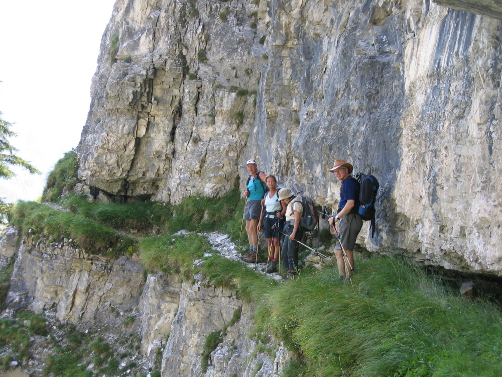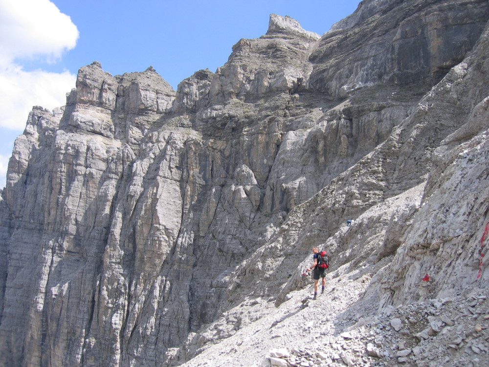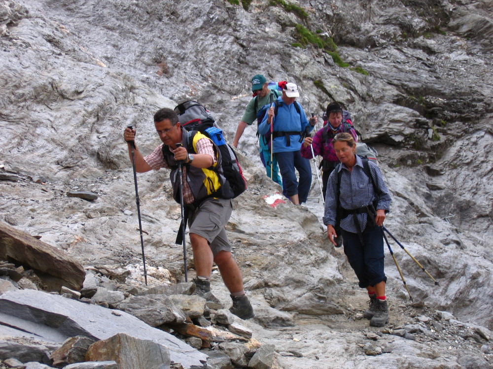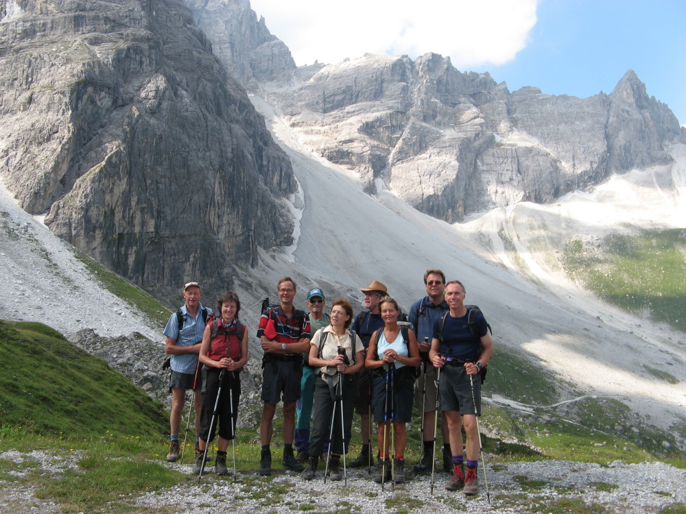Seit langem schon plante Helmut Reinhard eine Tour in den Tribulaunen durchzuführen. Es war alles schon geplant, abgesprochen und die Hütten reserviert . 2 Tage davor ruft mich Helmut an, dass er aus privaten Gründen leider nicht teilnehmen kann und ich die Tour alleine führen müsste. Also fuhren wir vom 20.Juli bis zum 23. Juli mit 10 Frauen/Männern Richtung Brenner zu unserem Tourengebiet.. 1. Tag Fahrt über Fernpass, Brenner nach Stein im Pflerschtal. Aufstieg zur italienischen Tribulaunhütte 2369 m. Nachmittags ging ein Teil der Gruppe Richtung Pflerscher Pinggl. Der andere teil nahm ein sehr kurzes Bad (Wasser + 6 Grad) im Sandessee. 2. Tag Heute steht die Umrundung der Tribulaune an. Mit leichtem Gepäck stiegen wir durch den steinigen Kessel unter Gschnitzer Tribulaun und Goldkappl durch auf das Sandesjöchl 2599 m. Ab hier queren wir leicht bergab gehend die nördlichen Schotterhänge des Gschnitzer- und Pflerscher Tribulaun. Kurz vor der österreichischen Tribulaunhütte mussten wir unter einem Schneefeld noch durchsteigen. Nach kurzer Rast ging es wieder über steile Schutthänge hoch zur Schneetalscharte 2642m. Hier wechselten wir wieder auf die Südtiroler Seite und stiegen in einem stetigen auf und ab durch den Koggraben zurück zur italienischen Tribulaunhütte. 3. Tag Von der Hütte aufwärts Richtung Pflerscher Pinggl. Oben am Grat entlang und über eine Hochfläche zum Joch unterhalb des Hohen Zahn. In einer halben Stunde standen wir auf dem Hohen Zahn 2929m hoch. Abstieg zur Scharte zwischen Hohen Zahn und Weißwandspitze. Hier querten wir auf einem Felsband die Südostwand der Weißwandspitzeund stiegen über den Südgrat hoch zum Gipfel 3017 m. Der Abstieg zur Magdeburger Hütte erfolgte durch den Schneesumpf und unterhalb des SW-Grates der Schafkampspitze vorbei zur Hütte 2422 m. Nachmittags stiegen noch ein paar unermüdliche hoch zum Stubenferner. 4. Tag Am letzten Tag unserer schönen Rundtour stiegen wir von der Hütte über die Ochsenalm zurück ins Pflerschtal nach Stein zum Parkplatz Text und Bilder: Ingo Pfäffle und Gerald Glatthorn |