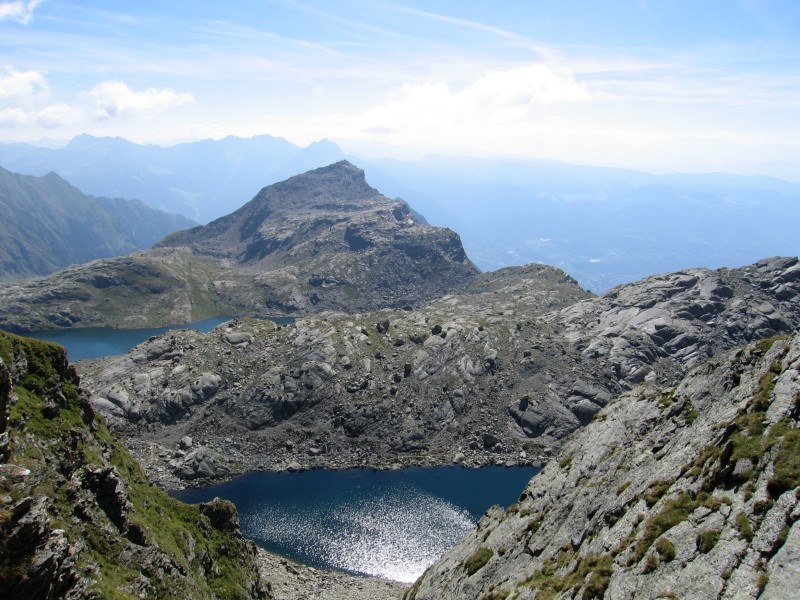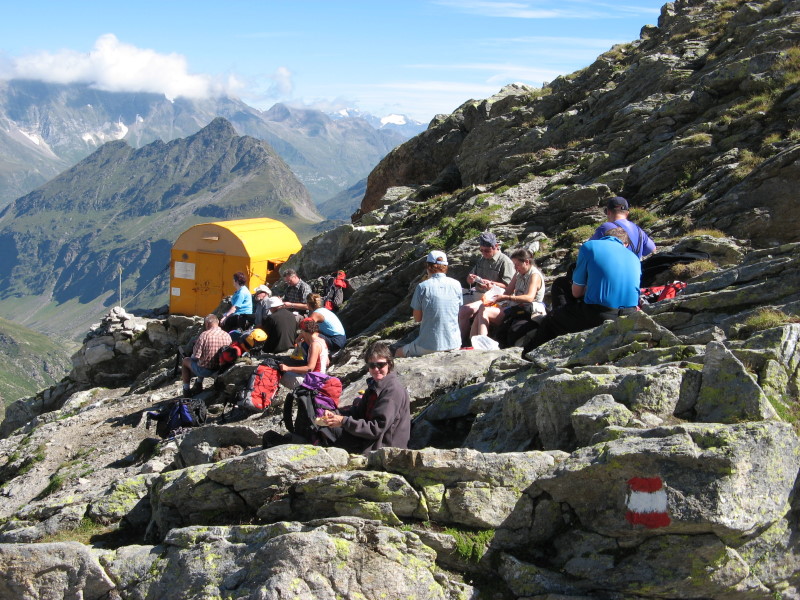 Ein Blick ins Internet im Vorfeld: der 1976 eingerichtete Naturpark Texelgruppe ist mit 33430 Hektar der größte Naturpark in Südtirol. Die günstige Lage, leicht erreichbare Zugänge machen das Gebiet während der Sommermonate zum Wanderparadies. Bekannt ist vor allem der „Meraner Höhenweg“, in 6 – 7 Tagestouren mit einer Gesamtlänge von nahezu 100 km um die Texelgruppe „herum“zu bewältigen. Mit ihren pyramidenförmigen Gipfeln und ihren Graten schiebt sie sich als Untergruppe vor die dahinter aufragenden Urgesteinsmauern der Ötztaler Alpen. Schon die Anfahrt der 14-köpfigen Gruppe dauert. Von Stetten über Imst, den Reschenpass, das sonnige Vinschgauer Tal bis Meran läuft alles noch. Der Verkehrsrummel in Meran jedoch ist nervtötend, noch schwieriger, die kleine Schilder Richtung „Tirolo“ ausfindig zu machen. Endlich können wir unsere Autos in die pralle Sonne an der Seilbahn Hochmut abstellen. Auf einem schattigen Waldweg geht es 1100 hm ins Spronser Tal hinein, später teilweise auf Plattenwegen über Steilstufen, an Wasserfällen vorbei zur kleinen, privaten Bockerhütte (1717m). Drei Stunden gemütliches Bergauf. Welch Freude gleich bei der Belegung des Matratzenlagers: richtige Federbetten vom Tigerfell- bis zum Schlumpfbezug! Ein fröhliches Bunt bietet ein Kontrastprogramm zum sonstigen Einheits-Grau-Braun der DAV-Decken. Und noch „doller“ dann die mächtigen Ritzen zwischen den Außenwand Holzlatten mit „Aussicht zwischendurch“ ( „Wie machen die das bloß im Winter, da schneit´s doch rein?“). Feinstes italienisches Abendessen an langen, mit Wachstuch bedeckten Tischen erwartet uns. So kennt man es von italienischen Hütten. Plötzlich ein kleiner Aufschrei: Durchs Fenster zu sehen gondeln zwei Ziegenböcke in der Materialseilbahn vorbei. Wozu, das sollten wir am nächsten Tag erfahren. Der zweite Tag beginnt mit Verhandlungen. Könnte der Hüttenwirt unsere Rucksäcke nicht.... nur 400 hm bis zur Oberkaseralm? Genau wie die Ziegenböcke? Er konnte. Ein schlechtes Gewissen haben wir nicht, denn schließlich stehen uns insgesamt 1800 hm an diesem Tag bevor. Dort angekommen, ein köstlicher Anblick: Die Kinder der Alm halten mit aller Kraft unsere Ziegenböcke fest, endlich dürfen sie los zur weiblichen Ziegenherde, sie rennen los... und schlecken Salz, der auf einem Stein liegt. Die Spronser Seenplatte ist erreicht. Die neun Spronser Seen bilden die größte hochalpine Seengruppe Südtirols – ein jeder in seiner ihm eigenen Form und Farbe zwischen 2100 und 2600 m, einer schöner wie der andere. Wie gerne hätten wir an diesen Seen bei diesem Traumwetter verweilt, doch lockt hier schon die markante Gipfelpyramide des Tschigat. In leichter Kletterei erreichen wir über die Milchscharte das orange angemalte Bivacco Lammer ( 2698 m). Endlich Mittag mit einem tollen Blick auf die Ostwände des Lodner und der Hohen Weiße! Für Gelächter sorgt auch eine richtig große Milchkanne vor dem Biwak. Welcher Scherzbold diese wohl auf diese Höhe geschleppt hat ? Über Blockgestein führt uns Ingo dann weiter zum Halsljoch (2808m) Das bedeutet für die ganz verrückten Höhenmetersammler Rucksackdepot und in II-er Kletterei hinauf auf den Tschigat (3000m) mit letztmaligem Ausblick auf die Spronser Seenplatte, Meran, den Cevedale. Für die weniger Verrückten mit dem zweiten Führer Jochen Schuh bedeutet das ein gemütlicheres Weiterwandern Richtung Lazins. Als die „Tschigat“-Gruppe den kleinen, aber oho-Abstecher hinter sich hat, geht die Aufholjagd los. Schier endlos in nördlicher Richtung über Blockgestein und Wiesen nochmals ca. 500 hm bergab zur nicht bewirtschafteten Andelsalm. Ein Zittern in den Knien verrät den Gipfelstürmern, dass ohne Abendessen an ein Weiterkommen nicht zu denken ist. Der direkte Blick auf noch zu bewältigende 500 hm steil bergauf zur Schafschneide( 2800 m) lässt manche doch etwas gequält in ihre Habseligkeiten beißen. Es sollte noch hart kommen in den letzten wärmenden Strahlen der Sonne. Schon beim Aufstieg zieht sich das Feld auseinander, Elke bietet sich an, beim Letzten zu bleiben, Jochen winkt mit den „Gemütlicheren“ von oben herab, Ingo motiviert: „Ich muss schnell nach oben, dem Hüttenwirt Bescheid geben, dass sie uns Quartiere und Essen zurückhalten.“ Oben auf der Lazinser Schneide sind fast alle so erschöpft, dass sie den Blick auf die Marmolada verpassen. Wieder bergab, vorbei am Graffensee, wir wandern, besser tappen nun schon weit auseinander vor uns hin, der gute Ingo hält durch Hin- und Herlaufen Verbindung. Eine kleine Spitzengruppe eilt voraus zwecks Quartierabsicherung. Ich selbst im Mittelfeld, habe ehrlich gesagt die Nase voll, als ich endlich die Stettiner Hütte, nochmals 200 hm über mir trutzig auf einem Felsplateau stehend, erblicke. Also nochmals 200 hm hoch, Schritt für Schritt. Nach einem traumhaften Bergtag auf einsamen, kaum begangenen Wegen, erreichen die letzten um 19.45 Uhr die Hütte. Ingo errechnet 2150 hm bergauf, 950 hm bergab. Wir sind geschafft, selbst das allabendliche Geplapper entfällt. Nur zu einer letzten Diskussion reicht es. Schaffen wir am nächsten Tag noch die Hohe Wilde und den Weg zur Lodnerhütte ? Als am nächsten Morgen um 6.00 Uhr alles raschelt, beschließt ein guter Teil der Gruppe: wir gehen nicht mit hoch auf die Hohe Wilde (3482m), sondern warten in der Hütte. Dreieinhalb Stunden später hören wir von einem unglaublichen Gletscherpanorama bei strahlendem Himmel am Gipfelkreuz. Die Zeit drängt, fast alle essen noch eine Knödlsuppe wegen der Salze. Der Übergang von der Stettiner Hütte zur Lodnerhütte (2259m) ist im hochalpinen Mittelpunkt der Texelgruppe. Im nördlichen Wegabschnitt mit dem Eisjöchl(2908m) als höchstem Punkt benutzen wir kurz den Meraner Höhenweg. Im Mittelteil mit der Johannesscharte (2854 m) als höchstem Punkt ist der steile und auf der Nordseite oft vereiste Steig teilweise durch Fixseile gesichert. Wir haben Gl